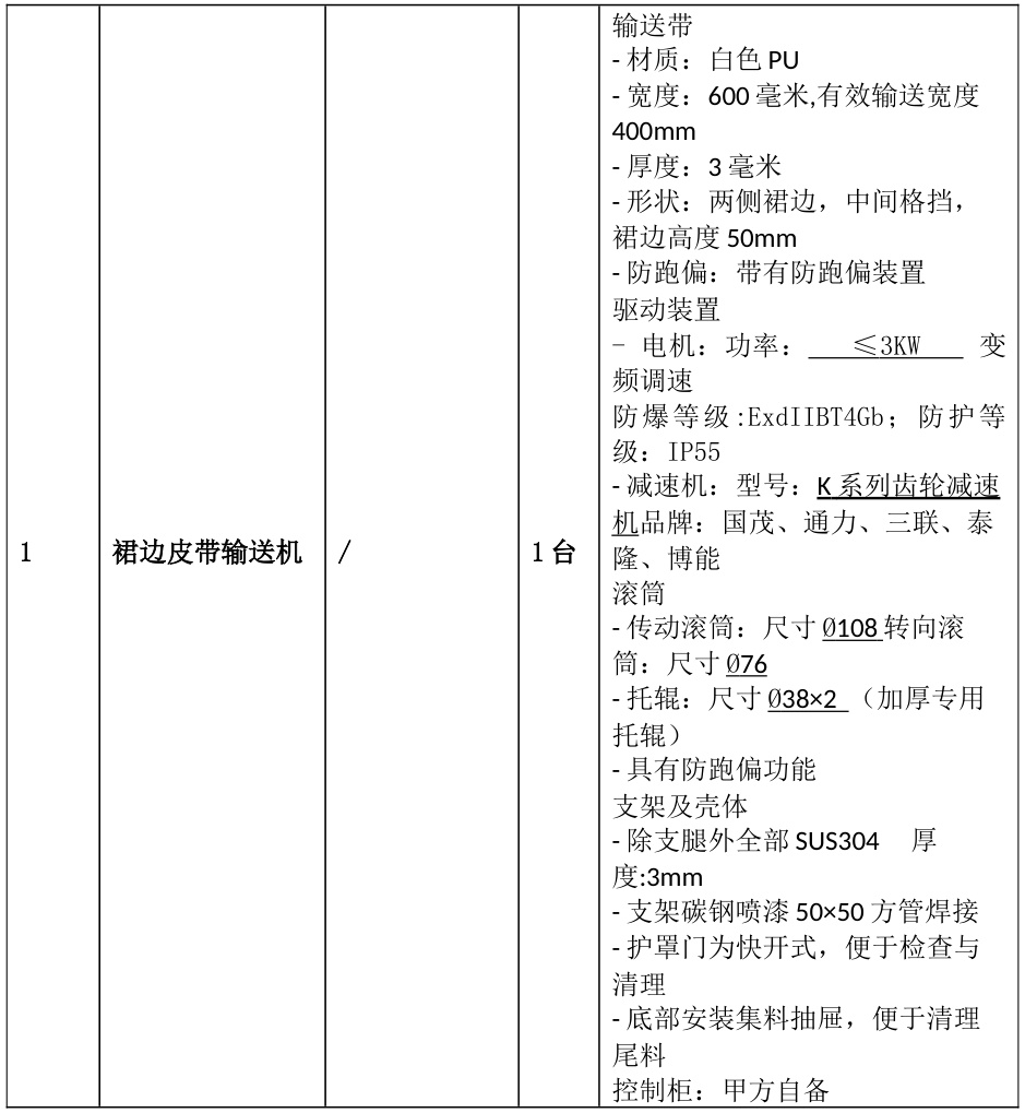 化工領域:防爆電機(ExdIIBT4Gb)+耐酸堿裙邊輸送帶,安全輸送化肥、樹脂顆粒。